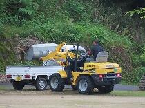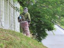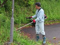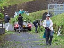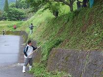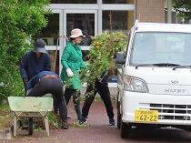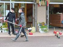 さっそく作業を始めました。グランド横の植え込み、東側駐車場横、保健室前、校舎東側斜面、刈ったり集めたりした草は、軽トラックで運んでいきます。