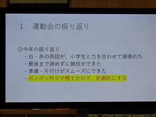 次に、委員会が全校生徒へ発表をします。今回は保体委員会から、運動会について、中学校総合体育大会について、メディア利用時間のチェックについてのお知らせを行いました。