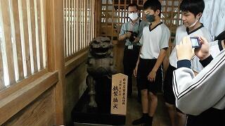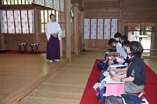 あいさつをした後、社殿で高千穂神社について学びました。国の重要文化財「鉄造の狛犬」も見せていただきました。