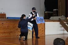 それぞれの学級で、命を守る行動として教室の戸締まりをした後避難経路を確認しながら整然と体育館に避難しました。警察の方に立ち会っていただき、不審者に扮した職員を迅速に確保する訓練も行いました。体育館に移動した後、警察の方から不審者対策の合い言葉「いかのおすし」をもとに、不審者に遭遇したときの適切な対処の仕方を学びました。