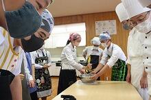 5月13日(金曜日)、延岡学園高校調理科の先生と高校生に来ていただき、中学3年生が調理体験学習を行いました。制服から調理師の服装に着替えた高校生はとても凜々しく、受け答えもしっかりしていて、中学生との違いを目の当たりにし、感心しました。今日の体験学習は、調理だけではなく、高校で専門的に学習していることや高校と中学校の違いなど、多くのことを学ぶことができました。上野中にお越しいただいた延岡学園高校調理科の先生方、そして高校生の皆さん、ありがとうございました。