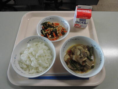 今日の献立は、麦ごはん、春野菜の煮物、海藻サラダ、牛乳です。