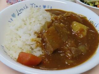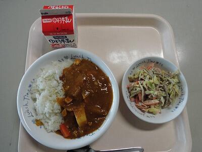 今日の献立は、ポークカレーライス、ツナサラダ、お祝いイチゴゼリー、牛乳です。