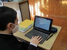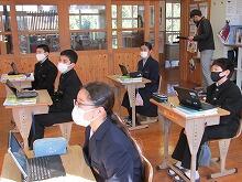 1時間目の中学1年生の教室では、社会科の地理の授業で、ブラジルの森林の減少について勉強していました。授業では二つのテーマでグループに分かれ、原因や森林の減少を止めるための政策についてインターネットで調べ、タブレットを使ってまとめていました。同じテーマの生徒と一緒にまとめたり発表したりするために、マイクロソフトチームスを使っている生徒の姿に頼もしさを感じました。