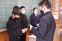 県立高校推薦入学者選抜検査の願書受付が始まりました。また来週は私立高校の入試も行われます。いよいよ入試本番です。今日は入試直前の中学3年生を応援するために生徒会の計画で激励集会を行いました。集会では、代表生徒が激励の言葉を述べ、その後、3年生の合格を祈って1・2生から手作りのミサンガを渡しました。