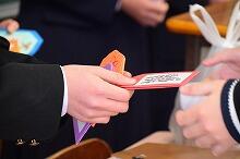 さらに教室に戻ってからは、1年生が3年生へ手作りのお守りを渡しました。もらった3年生はとても喜んでいました。
