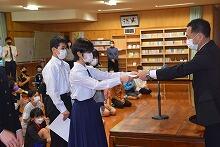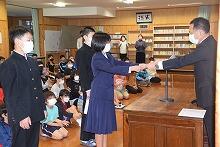 11月29日(火)、全校児童・生徒が図書館に集合し、「表彰集会」を行いました。表彰は、スポーツ少年団や中学校の部活動の大会、サイエンスコンクール、地区英語暗唱弁論大会等で入賞した児童・生徒です。