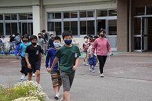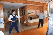 5月6日(金)、小中合同で「不審者対応の避難訓練」を行いました。今回は、「発見した先生や近くにいた先生たちで不審者を子どもたちがいないところへ追い込む訓練」と「子どもたちの安全を確保し、避難する訓練」とを行いました。不審者役は上野駐在所のおまわりさんです。訓練の後、職員にはさすまたの使い方や実際に対応するときに気をつけることなどを教えていただきました。