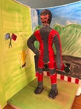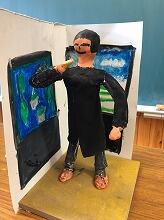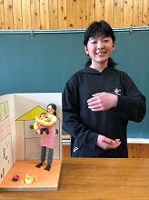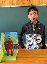 小学6年生が図工の時間に「将来、自分がしたい仕事」を粘土細工で表現しました。児童と作品を一緒に撮った写真が階段に掲示してありました。