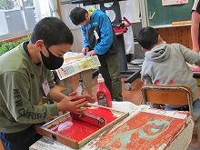 小学5年生が図工の時間に版画に取り組んでいました。今回の版画は「一版多色刷り版画」で、一枚の版木を刷って彫ることを繰り返しながら色を重ねていき完成させます。彫刻刀を上手に使い、次に使う色を考えながら制作を進めていました。出来上がりが楽しみです。