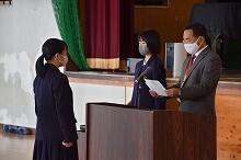 任命式は選挙管理委員会が運営を行い、旧執行部には校長が、旧全校専門委員長・副委員長には旧生徒会長がそれぞれ感謝状を贈りました。3年生の役員は1年間の活動を振り返り、あいさつをしました。