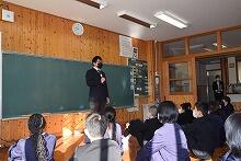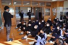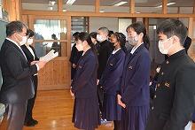 小中合同の始業式を終えた後、中学生は校舎3階で集会を行い、英単語のテストの表彰や保健面・生活面の話を担当の先生が行いました。
