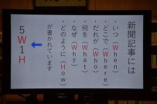 講師の方の紹介のあと、例文をもとに新聞記事の5W1Hについて話していただきました。