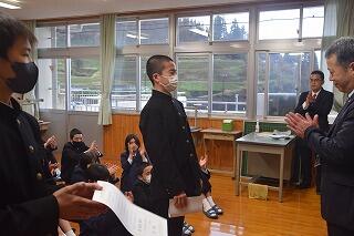 はじめに表彰です。年賀状・版画コンクールに入選した2名に賞状が渡されました。