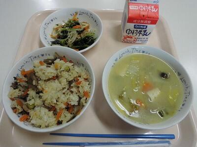 きんぴらご飯には高千穂牛や椎茸、味噌汁には白菜や大根が地域の食材として使われています。