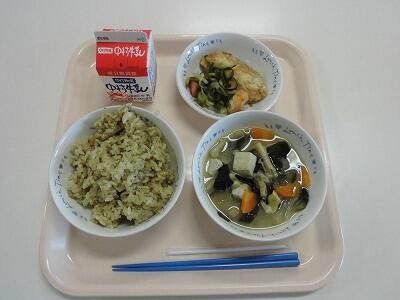 ごはんは、高千穂の釜炒り茶(粉茶)と高千穂産米の茶飯。そのほかに、キュウリ、ピーマン、茄子、玉葱、トマト、味噌などが使われています。