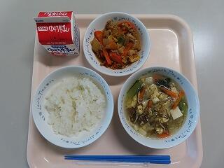 麦ごはん 豚肉のケチャップ炒め もずくスープ 牛乳