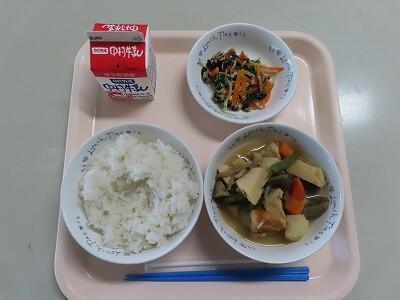 麦ごはん たけのこのうま煮 ほうれん草とツナのお浸し