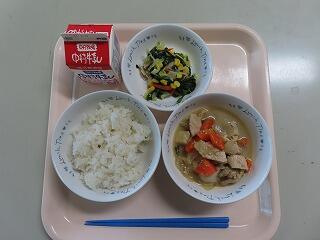 麦ごはん 鶏肉と里芋の味噌煮 ほうれん草サラダ 牛乳