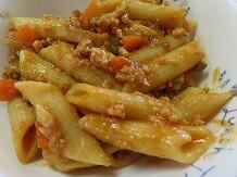 今日の献立は、ミルクパン、ペンネポロネーゼ、アスパラのサラダ、牛乳です。