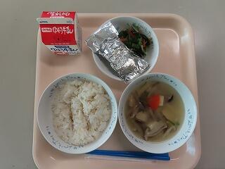麦ごはん 魚の味噌ホイル焼き のっぺい汁 牛乳
