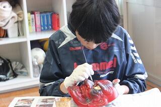講話の後は、実際に陶器でつくられた神楽面に彩色の体験です。