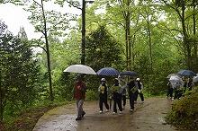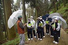 小雨が降るあいにくの天気でしたが、きれいに整備された杉林は緑が美しく、とてもよい話を聞くことができました。