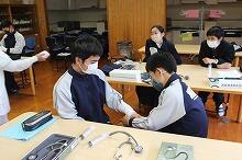 5月6日(金)、聖心ウルスラ学園高等学校看護科の先生にお越しいただき、中学3年生が「看護体験学習」を行いました。今回の体験学習では、聴診器や血圧計を実際に使い、心臓の鼓動を聴いたり血圧を測定したりしました。後半には、新生児の人形を使い、沐浴や授乳をさせたりしました。