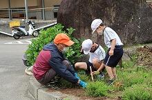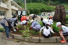 小学1・2年生が上野地区の老人クラブや高千穂町の民生・児童委員さんと一緒に花壇の除草作業を行いました。