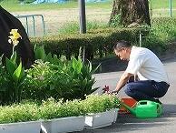 花壇やプランターには、毎日朝に子どもたちが水をかけてくれますが、さらに教頭先生も朝と夕方、水をまいたり草をとったりしています。また、休日は地域の方も水をまいてくださっています。ありがとうございます。