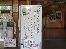 子どもたちが登校すると、玄関ではペッパー君が迎えてくれます。最近、プログラムを作り、ペッパー君が子どもたちに手の消毒をするように呼びかけています。その後には、児童の家庭より届いたひまわりも飾ってあります。ありがとうございます。