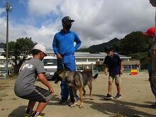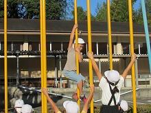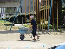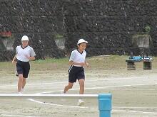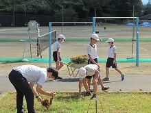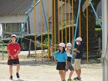運動場の北側から校舎に向かってロープが結んであり、そのロープには筒が通してあります。これはソフトボール投げの距離を伸ばすために小学校の体育主任の先生が準備したものです。小学4年生が集まり、早速チャレンジしていました。途中から中学生が参加すると、小学生よりも遠くまで筒を投げていました。