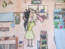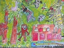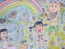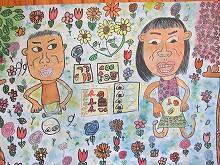 小学3年生の掲示板に子どもたちが描いた「読書感想画」が掲示してあります。夏休みに自分が読んだ本の感想画です。自分が印象に残った場面をそれぞれ絵に表しています。登場する人や動物の顔が表情豊かに描いてあり、色塗りも丁寧で、みんな上手に描いています。