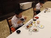予定どおりホテルに到着しました。夕食は結婚式の披露宴で使う広い会場でした。男子は完食でした。