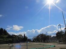 先ほどの雨も止み、上野の空に青空が見え、日の当たる場所では暖かさを感じました。下の写真ではわかりにくいと思いますが、運動場を走っている児童の後に見えるのが6年生が石灰で描いた大仏です。