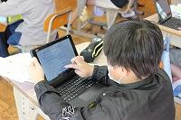 中学2年生が社会科の授業を受けていました。内容は地理で、「中国地方の特徴」でした。以前であれば教科書に書いてあることを暗記するのが社会科の勉強でしたが、今は「問い」に対して自分で予想を立て、資料集だけではなく、一人一台のタブレットを使って調べたり、調べたことをもとに自分たちで話し合ったりします。そのためには時間が必要です。今日の授業ではICTを活用して前の時間の復習や今日の学習課題を確認することで、子どもたちが調べたり話し合ったりする時間を増やしていました。