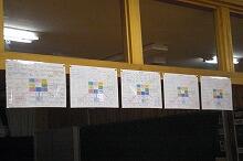小学6年生が図工の時間に「将来、自分がしたい仕事」を粘土細工で表現しました。児童と作品を一緒に撮った写真が階段に掲示してありました。