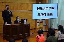 生活委員会からの連絡は「上野小中礼法7箇条」についてでした。プレゼンテーションを使い、中学校の生活委員長がみんなにわかりやすく話していました。上野小・中学校礼法7箇条.pdf
