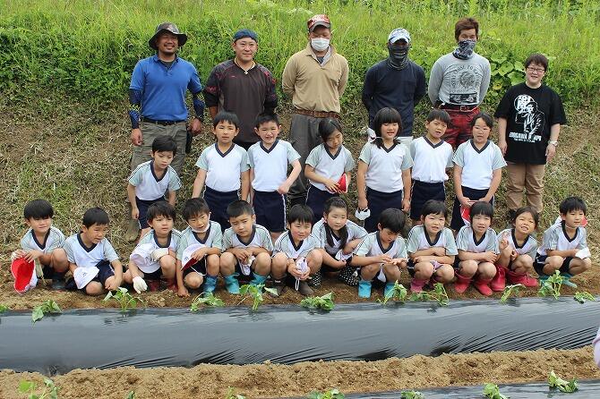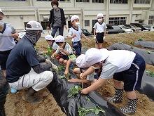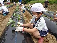 5月20日(金曜日)、小学1・2年生が学校の近くにある畑にイモの苗を植えました。子どもたちは楽しそうに苗を植えていました。秋の収穫がとても楽しみです。