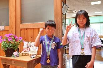 4月末から5月にかけての大型連休前後の陸上と空手の大会で活躍した子どもたちにメダルや賞状を見せてもらいました。最後は校長室前で記念写真です。中学生の部活動の大会が6月4日(土)と5日(日)に開催されます。その大会に向けた選手推戴式を行うときに、全校児童生徒の前でこの子どもたちを表彰します。おめでとうございます。
