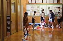 小中合同運動会が終わり、1時間目は、「修学旅行合同学習会」に行った中学2年生を除いた全校児童・生徒で片付けを行い、玉入れの球や万国旗を拭いたり、体育倉庫を片付けたりしました。また、中学生は6時間目も片付けをしました。今日の上野は朝は曇っていましたが、次第に日差しが強くなり、外に干していたはちまきなどもよく乾きました。