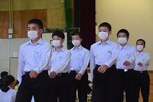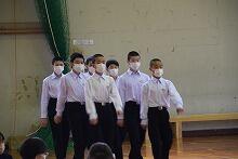 上野中学校の男子剣道部は県中学校秋季体育大会に西臼杵地区の代表として出場します。今日は全校朝会を行い、地区大会の表彰と選手推戴式を行いました。式では、代表生徒が試合に臨む決意を述べ、生徒会長からの激励の言葉や選手宣誓を行いました。