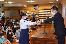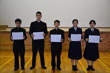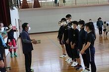 11月29日(火)、全校児童・生徒が図書館に集合し、「表彰集会」を行いました。表彰は、スポーツ少年団や中学校の部活動の大会、サイエンスコンクール、地区英語暗唱弁論大会等で入賞した児童・生徒です。