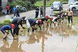 JA青年部の方に整えていただいた学校近くの田んぼで、膝近くまでつかりながら元気に苗を植えました。「おいしくなーれ!」のかけ声に合わせて4、5本の苗をテンポよく植える子どもたち、張り切りすぎて躓いてしまう場面もありましたが最後まで笑顔で活動できました。