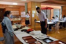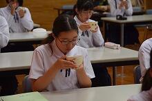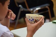 お菓子と一緒に抹茶をいただく中学生の表情は、とてもうれしそうでした。時間を割いて子どもたちに指導していただきました宗悦先生、ありがとうございました。