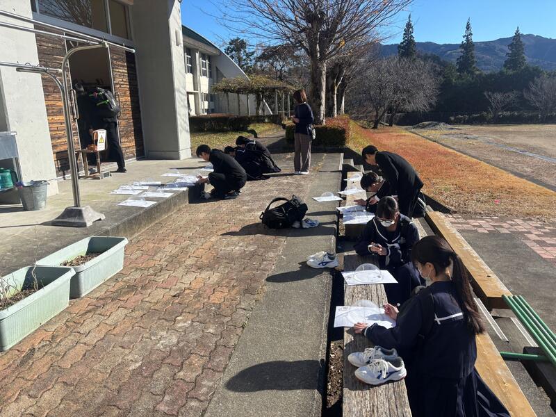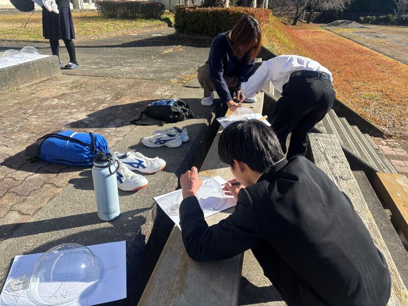 3年生の理科の授業では「透明半球」(懐かしい方もいらっしゃると思いますが…)を使い、太陽の動きを調べていました。午前中、生徒は授業と授業の合間に1階ベランダに下りてきて油性ペンで印をしていました。