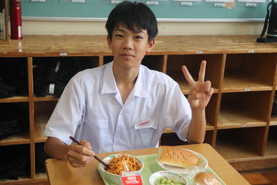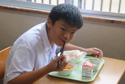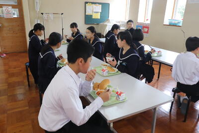 いつもの3A教室ではなく、ランチルームで、間隔をとりながら着席しました。楽しい給食の時間でした!