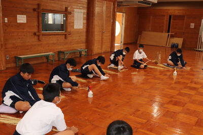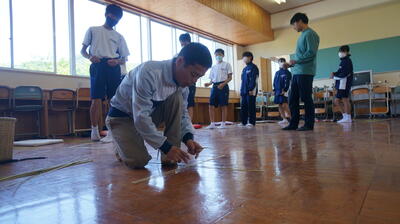 次に、「場を清める=清掃」です。全校生徒78名の皆さんが一斉に、清掃をすることでどのような効果があるでしょうか?2・3年生の教室移動では、学級のみんなで力を合わせて清掃をしました。その際、「ありがとう」という言葉が聞こえてきました。清掃をすることで感謝の心が湧いてきます。自分のためだけでなく、誰かのために清掃することで、自分が役に立っていることを実感できますし、そこに感謝の言葉があったならばとても嬉しいし、もっとやる気が湧いてきますね。