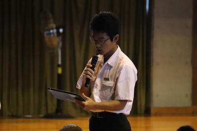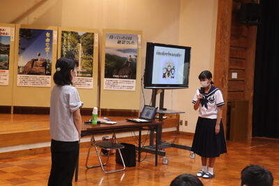 次に生徒会から夏休みに取り組んでほしいこととして「チャレンジ宣言!」が発表されました。「チャレンジ宣言」の名の通り、「失敗」や「成功」があるのではなく、チャレンジすることが大切というこの企画。生徒会から2つのチャレンジ宣言が提案されました。