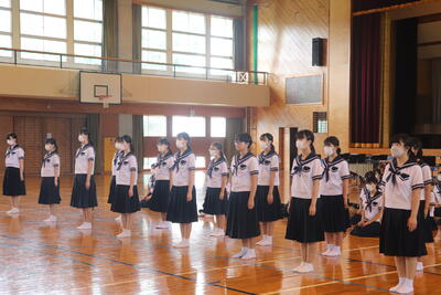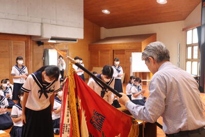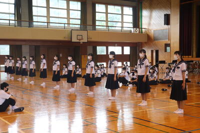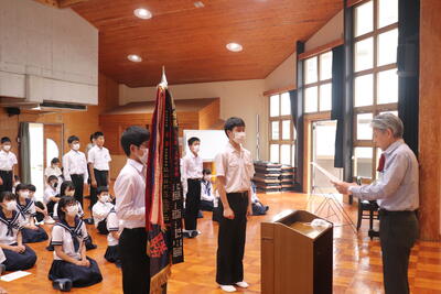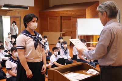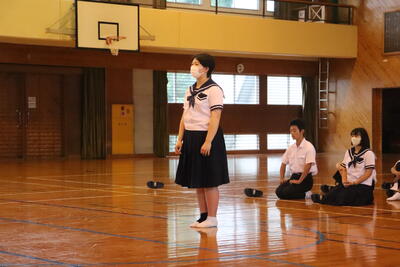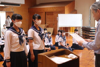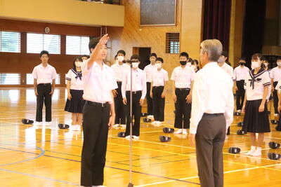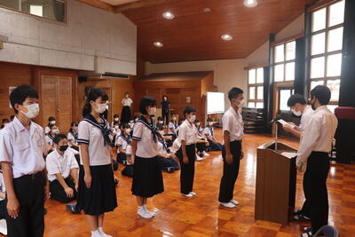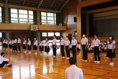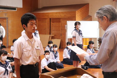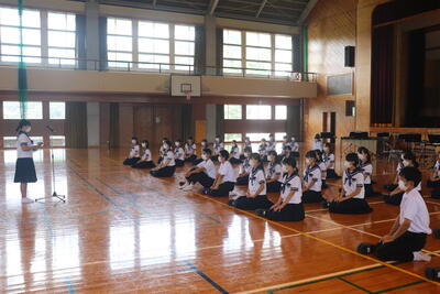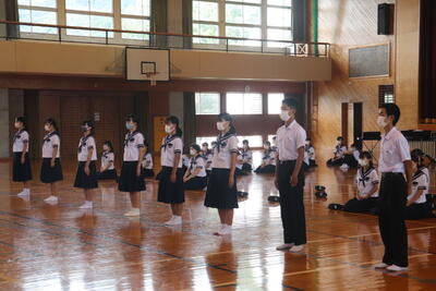 生徒指導の一成先生からは「まず、始業式に日之影中学校の皆が大きな事故や怪我無く今日を迎えられたことがうれしい。先生が4月から言ってきていること、「人としての心をもって接すること。」ちゃんとできていますか?1学期、相手を傷つけたり、思いやりをもって行動できなかったりしたことはなかったでしょうか?いま一度振り返ってみて、できていなかった、努力が足りなかったと思ったなら、今から変わってください。皆さん2学期に向けてそれぞれが、目標や、志をもっているだろうと思います。それに向けて行動していきましょう。」とお話ししてくださいました。
